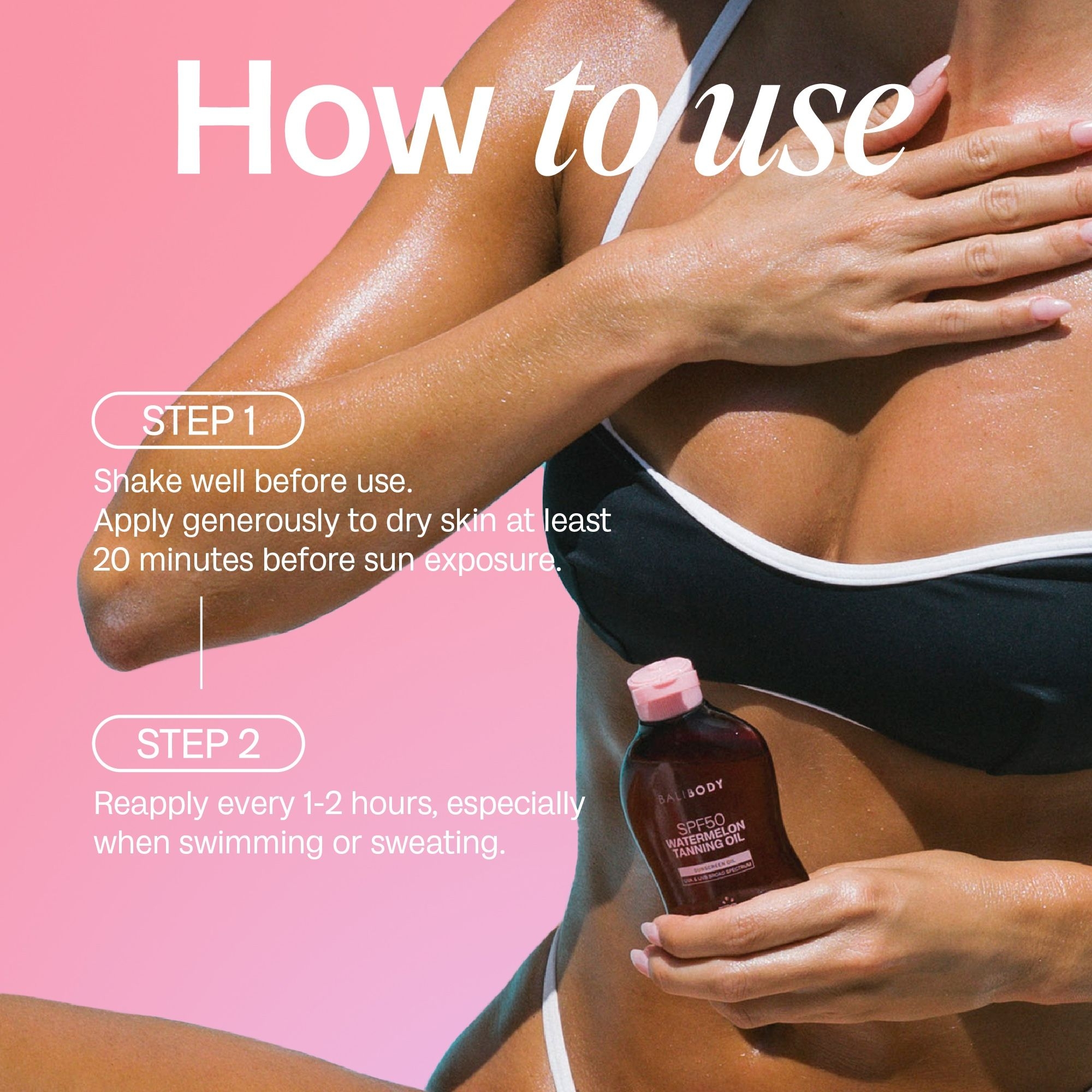 Перед використанням добре струсіть флакон. Рівномірно нанесіть достатню кількість олії на суху шкіру за 20 хвилин до виходу на сонце. Для оптимального захисту оновлюйте нанесення кожні 2 години або після купання.