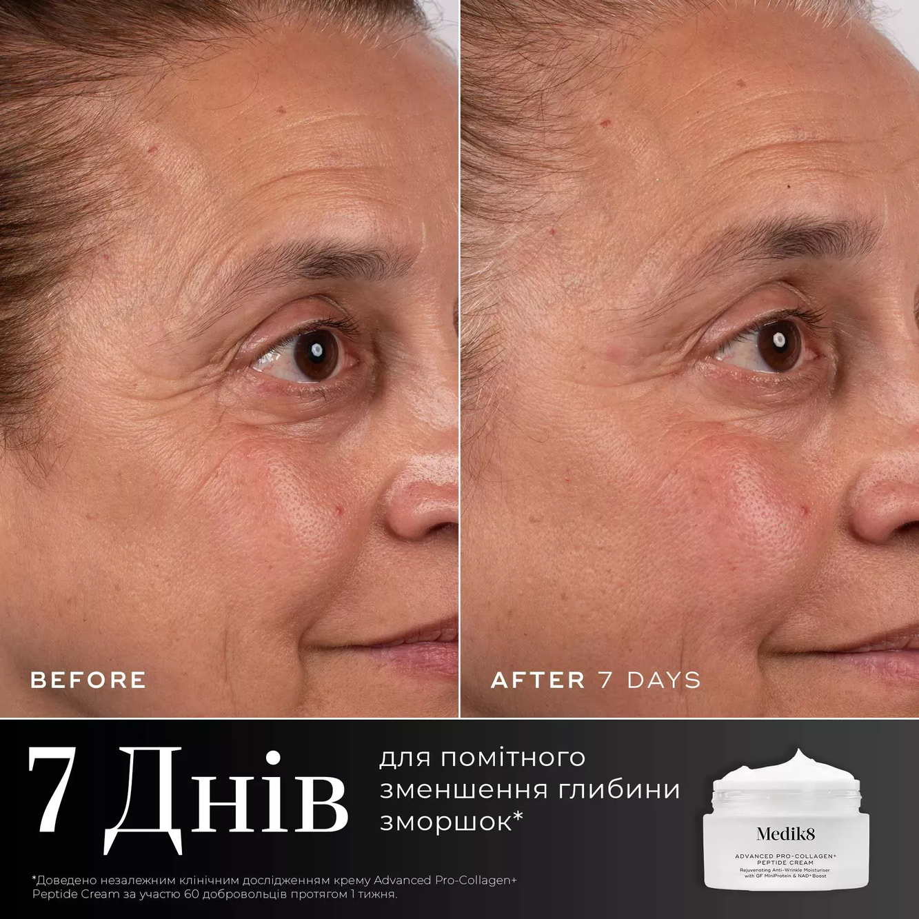 Клінічно доведено: після першого застосування шкіра виглядає гладшою, а вже за 7 днів зменшується глибина зморшок.