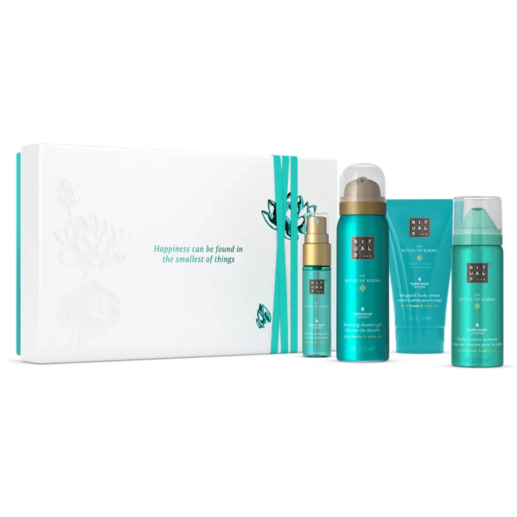 Відчуй атмосферу літа у будь-яку пору року з The Ritual of Karma у маленькому подарунковому наборі. Усередині — пінка для душу, крем для тіла, мус-лосьйон та спрей для волосся і тіла. Формули з лотосом і білим чаємдарують легкість, сяяння та глибоке зволоження завдяки комплексу Hydra-Boost.