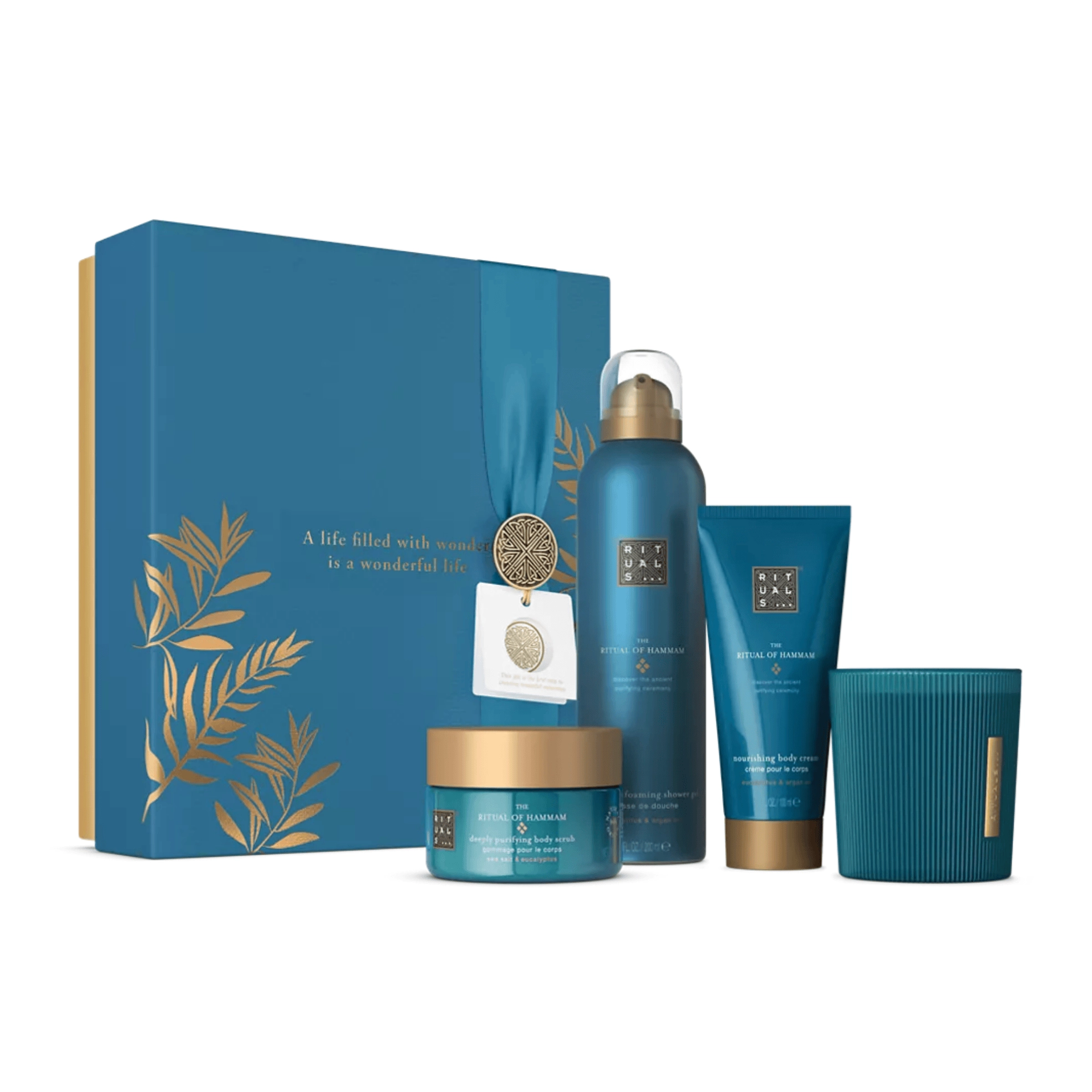 Ця чудова подарункова коробка — ідеальний подарунок для друга чи члена родини або для того, щоб побалувати себе! Подаруйте собі один з найстаріших очищувальних ритуалів за допомогою цих очищувальних продуктів на основі розмарину, арганової олії та евкаліпта. У комплект входять пінний гель для душу, крем для тіла, скраб для тіла та ароматна свічка. Безкоштовна багаторазова розкішна подарункова коробка може отримати нове життя, зберігаючи в ній фотографії, листи чи інші речі.
