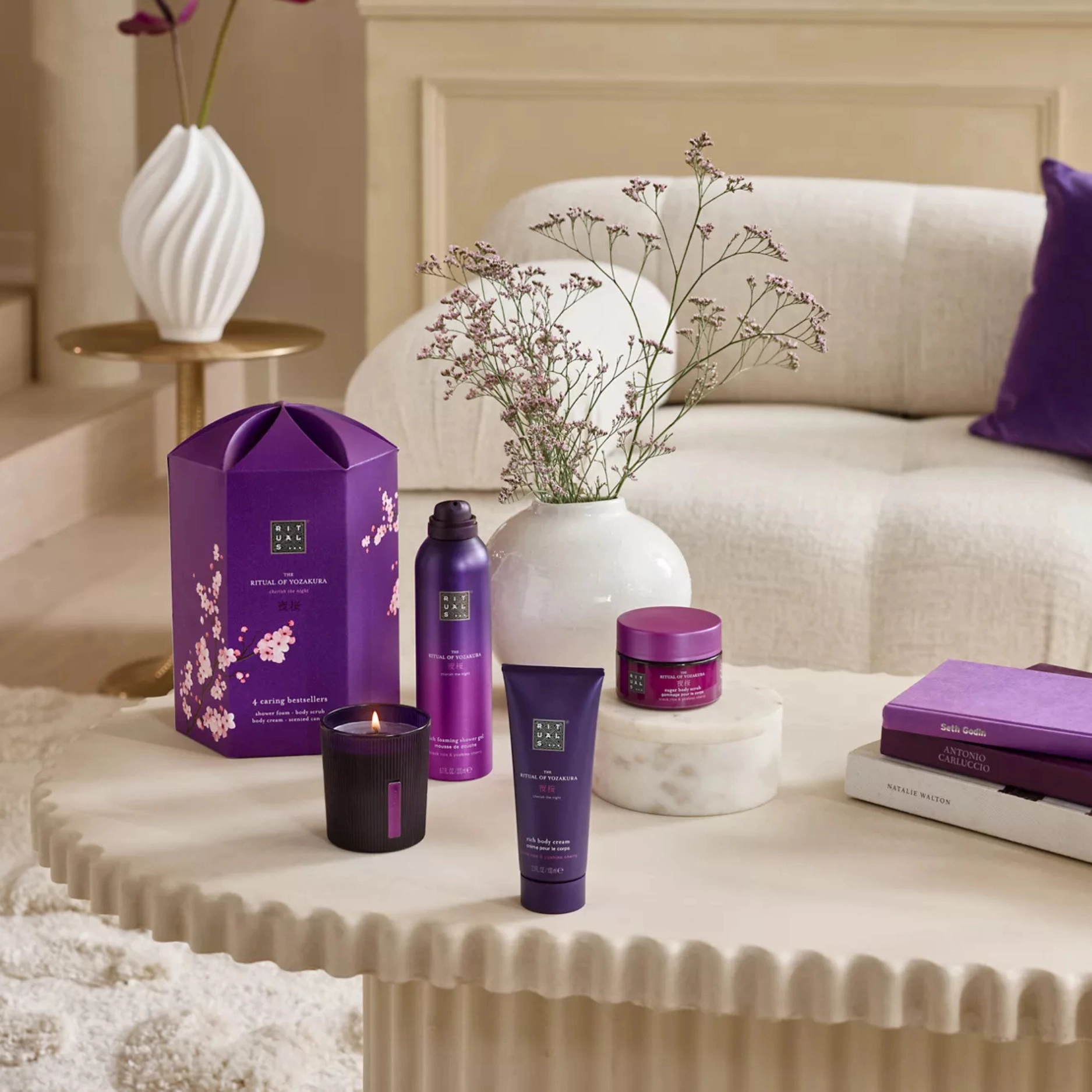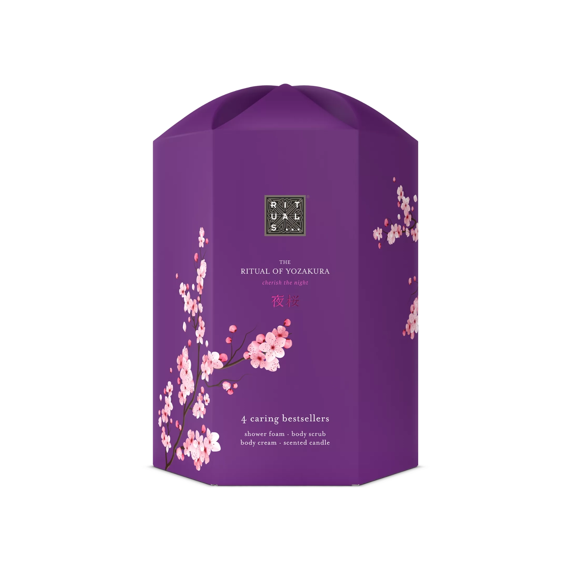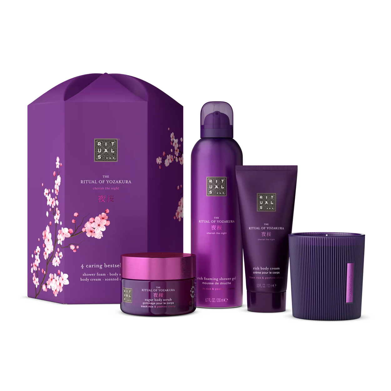 Цей розкішний подарунковий набір — ідеальний вибір для себе або як подарунок близькій людині. У ньому зібрані засоби для догляду за тілом та ароматерапії: пінка для душу, крем для тіла, рожевий цукровий скраб і ароматична свічка. Всі продукти збагачені екстрактом чорного рису та ароматом вишні Йосіно.